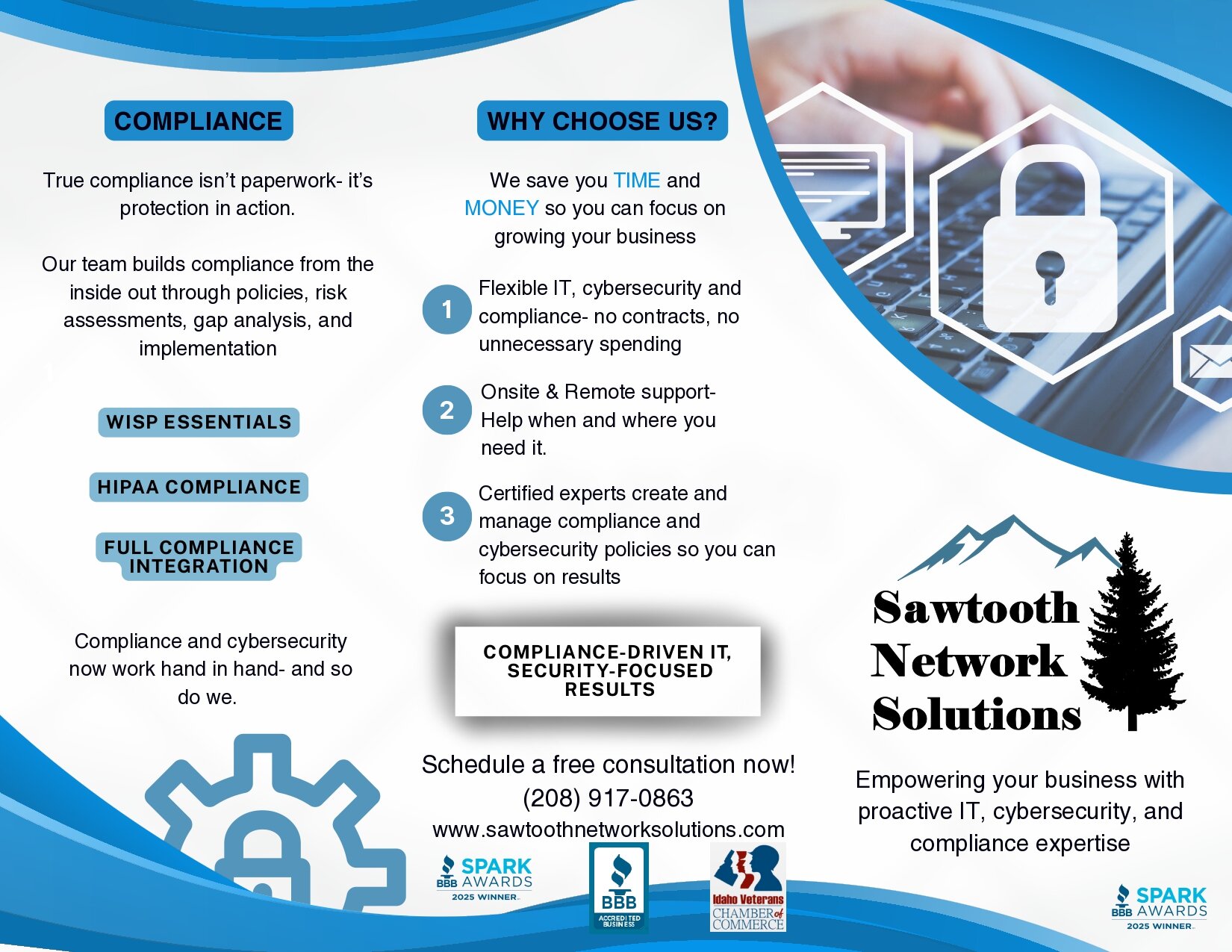 Sawtooth Network Solutions drives growth and success by assisting businesses with continuity plans, recovery plans, regulatory compliance, and employee training in cybersecurity and HIPAA compliance. Let us help you achieve your business goals and accelerate your success.